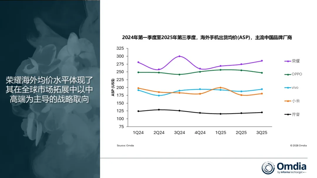 此外,荣耀在全球化业务中坚持将中高端产品作为战略主攻方向。Omdia报告称,荣耀将资源更多投入在300美元至499美元价位段。2025年前三季度,该价位段出货量占荣耀海外总出货量的约23%,为中国主要手机品牌厂商中占比最高水平。